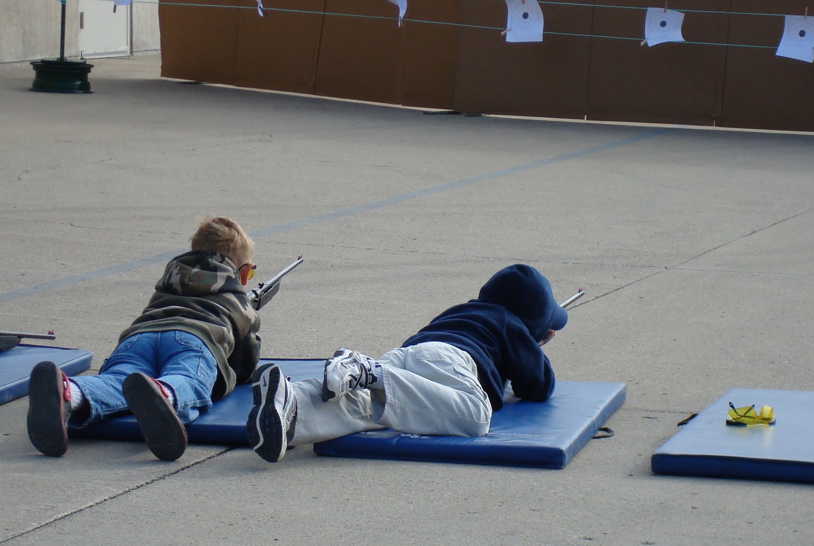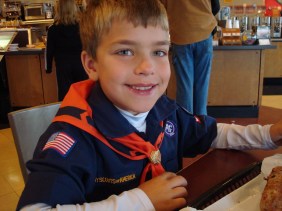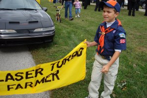 Curtis is now old enough to join the Cub Scouts.  He is having a blast!  Today we went over to the Track for Cub Scouts Day at the Track.  Curtis was able to shoot a BB gun, shoot a bottle up in the air using air, drive a RC monster truck in a race, use a marshmallow gun and bow.  After all the fun at the Track, Curtis marched in the parade for the Speedway Spectacular.  He held a banner for one of the cars driving in the parade.  Once we got to Leonard Park, Curtis was able to play a variety of games.