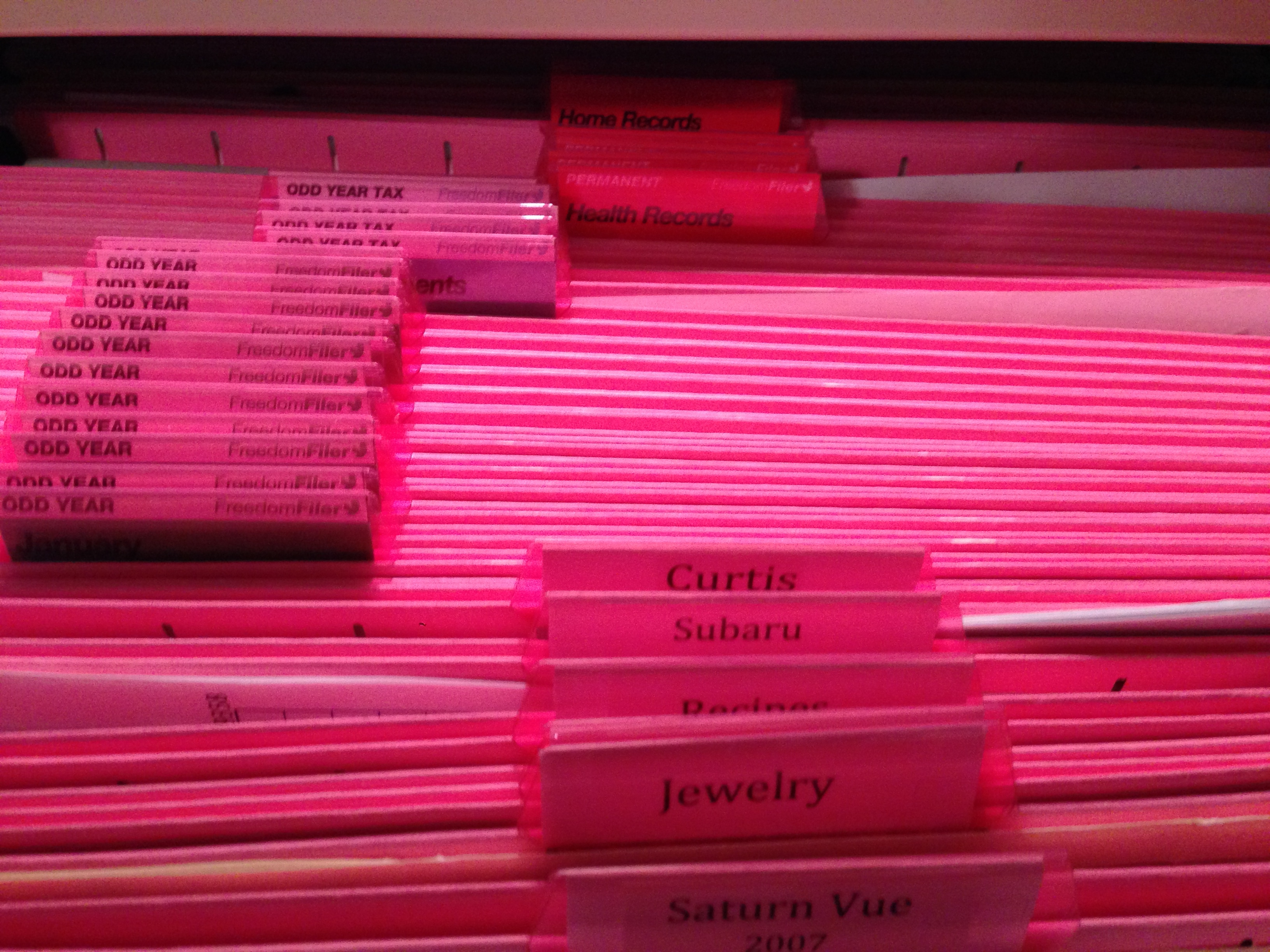 Well, paper continues to be my nemesis.  Last July I purchased the Freedom Filer system.  Though it is expensive, it is well worth the money.  Since July 2012, I have minimized the amount of paper that takes over my space.  Many of the tips and tricks I’ve learned are really common sense.  I keep a recycling basket in my bonus room for paper.  As soon as I get the mail I sort mail into three categories: keep, recycle, and shred.  It is amazing that if you sort the mail that is brought in, the paper pile doesn’t overtake the desk or table.  Other paper that comes in from work, doctor visits, car maintenance, tax documents, etc: I stack them in one location and file every 1-2 weeks.  Since I have been using the Freedom Filer system, I have an organized method of keeping the paper I want or need to keep.  Even my son’s artwork and school work.